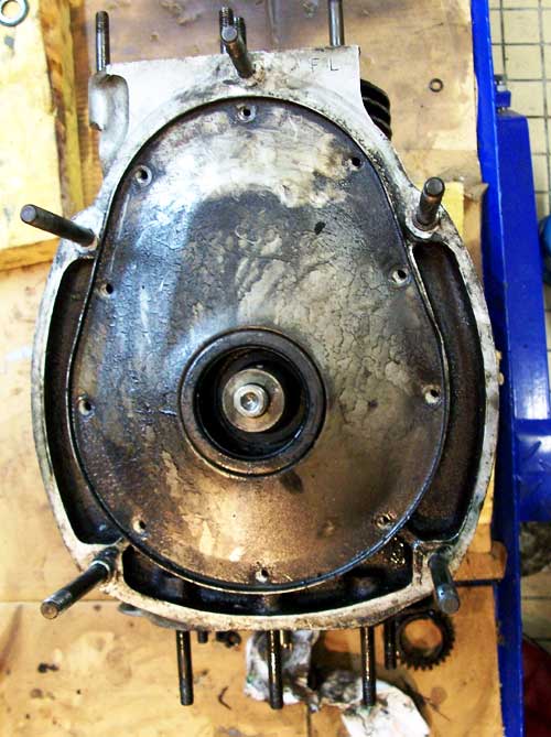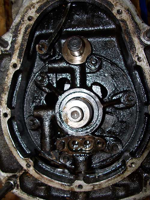 Une fois les pignons enlevés, on arrive au support de palier arrière. On voit sur cette photo, de bas en haut, les logements des pignons de la pompe à huile, le bout du vilebrequin, l'axe du pignon de chaîne de distribution et le patin du tendeur de chaîne. Le ressort du tendeur était cassé, ce qui fait que la chaîne avait commencé à attaquer le carter.