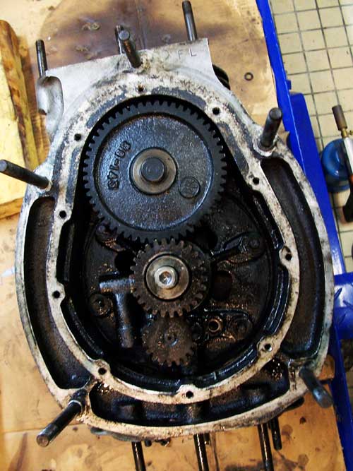 Le pignon moyen au centre est pris sur le vilebrequin. Le petit pignon inférieur est celui qui entraîne la pompe à huile. Le gros pignon supérieur entraîne la chaîne de distribution par le biais d'un autre pignon, solidaire et d'un diamètre inférieur de moitié. Car, dans sa grande sagesse, Erling Poppe, concepteur de la S7, a doté cette machine d'une transmission par cardan mais a conservé une chaîne dans le moteur pour la distribution. Pourquoi pas des pignons, that is the question ! |